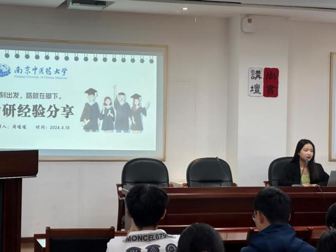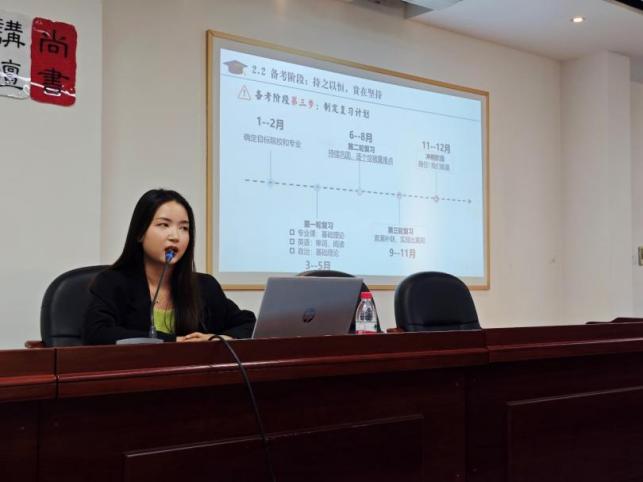 第一位主讲人周媛媛博士为大家带来了主题为“即刻出发,路就在脚下”的考研经验的分享。周媛媛博士从“为什么要考研、如何参加考研、考研需要准备什么”三方面进行阐述,启迪同学们思考考研的初心。
