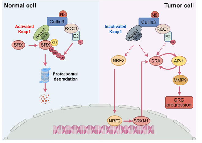 近日,贾立军研究团队通过蛋白质组学等前沿技术,发现了重要的致癌分子机制:CRL3Keap1作为E3泛素连接酶,调控硫氧还蛋白-1SRX)的降解,从而促进结直肠癌的发生与进展。研究表明,Keap1能特异性结合SRX,并通过其BACK结构域促进SRX在第61位赖氨酸的泛素化降解。当Keap1功能失活时,SRX会在细胞内积累,进而激活AP-1/MMP9信号通路,推动肿瘤的增殖和转移。