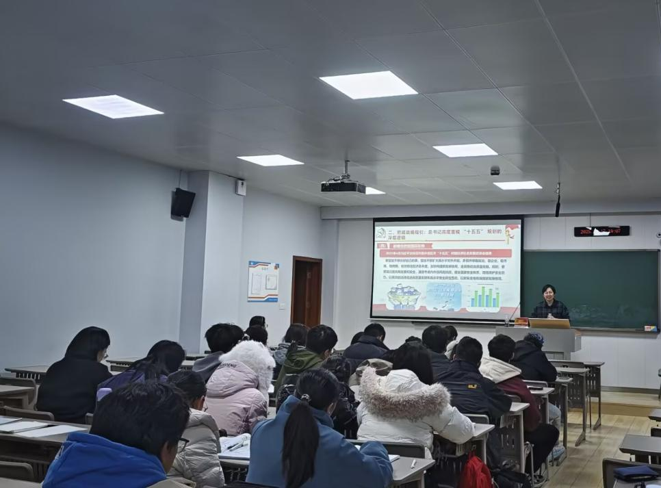 随后,徐璐老师以《锚定新蓝图,挺膺建新功:学习党的二十届四中全会精神》为主题开展培训第一讲。徐璐老师详细讲解了二十届四中全会的精神内涵。以“村村通路,网络助农服务发达”的过往经历为索引,徐璐老师用通俗易懂的语言和身边发生的现实案例,让同学们深刻体会到了政策落实给人民带来的变化与便利,并进一步理解了全会精神的重要意义。
