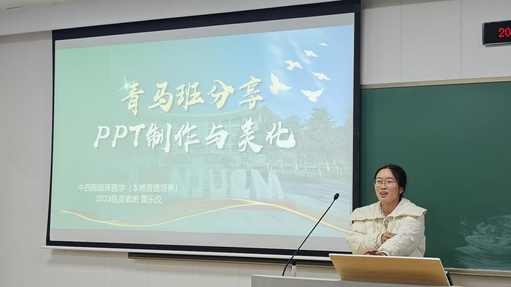 中西临23灵素班黄乐仪同学围绕PPT实战话题展开,她向同学们介绍了从逻辑建构到视觉呈现的高效表达,着重讲述了PPT的美化,并强调多看多学多练是提升PPT制作水平的基本方法。