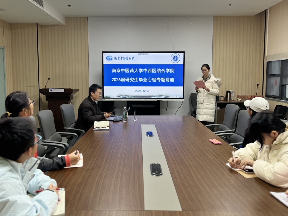 为帮助毕业班研究生科学应对学业、科研、就业等多重压力,tyc1286太阳成集团特邀南京师范大学心理健康咨询科主任裴涛副教授,开展《解码压力 精准调控——研究生心身健康调节》心理专题讲座。公司研究生负责老师孙文渊、学工办辅导员邱子倍以及全体2026届研究生参加讲座。讲座由2024级中西医结合基础专业甘易雯主持。